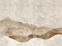 Silent Peaks Mystery - Dit landschapsschilderij onthult een serene en minimalistische afbeelding van een bergachtig gebied, gedrapeerd in subtiele aardetinten en zachte heuvelachtige vormen. Centraal staan drie verschillende lagen bergen, waarvan elk met een unieke textuur en kleur; de voorgrond kenmerkt zich door donkerder bruine tinten, terwijl de achtergrond zich veegt in zachtere beige en crème tonen. Opvallend zijn twee kale, bladloze bomen op de voorgrond, hun donkere silhouetten stekend tegen het lichtere achterland. Boven de bergen zwermt een groep kleine vogels in V-formatie, wat een dynamisch element toevoegt aan het anders rustige tafereel. De achtergrond van het schilderij is een geweven textuur, die een rustiek en haast tastbaar oppervlak creëert. Dit minimalistische en kleurrijke schilderij is een uitstekend voorbeeld van modern minimalistisch kunst.