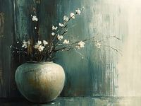 Silent Petals Fall - Dit bloemen schilderij toont een rustieke, verweerde vaas met fragiele witte bloesems tegen een achtergrond van zachte, donkergroene en blauwe tinten, die diepte en textuur geven.