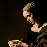 "Silent Prayer" is een verfijnd kunstwerk dat een serene en contemplatieve sfeer oproept. In dit beeld, geïnspireerd door de klassieke schilderkunst, zien we een jonge vrouw gehuld in aardse tinten, verzonken in diepe gedachte terwijl ze een eenvoudige schaal vasthoudt. Haar houding en uitdrukking stralen een tijdloze melancholie uit,…