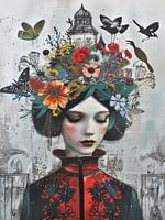 Silent Spring Symphony - Dit surrealistische vrouwen schilderij toont een jonge vrouw met gesloten ogen, gedecoreerd met een weelderige hoed van bloemen en vlinders, tegen een achtergrond van grijze architectonische elementen en vliegende vogels.