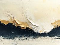 Het schilderij toont een dynamisch spel van beige, goud, witte, en donkere verfstreken die als golven over het doek lijken te rollen. De kleuren vloeien en botsen, suggererend de beweging van water in een zee. Lichtere tinten creëren een gevoel van lichtval, terwijl donkere accenten diepte en contrast brengen. De penseelstreken zijn…