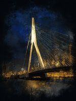 In dit werk staat de Erasmusbrug als een lichtgevend sculptuur in bijna volledige duisternis. De kabels trekken als fijne lijnen door een diepblauwe nacht, terwijl de stad onderaan subtiel gloeit. De brug lijkt niet alleen architectuur, maar een symbool van balans en spanning.