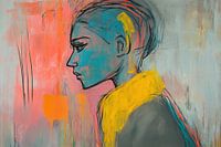 Silent Thoughts in Color - Dit expressieve vrouwen schilderij toont een zijaanzicht van een vrouw met een opvallend blauw gezicht contrasterend tegen een achtergrond van levendige, abstracte penseelstreken in roze, oranje en geel.