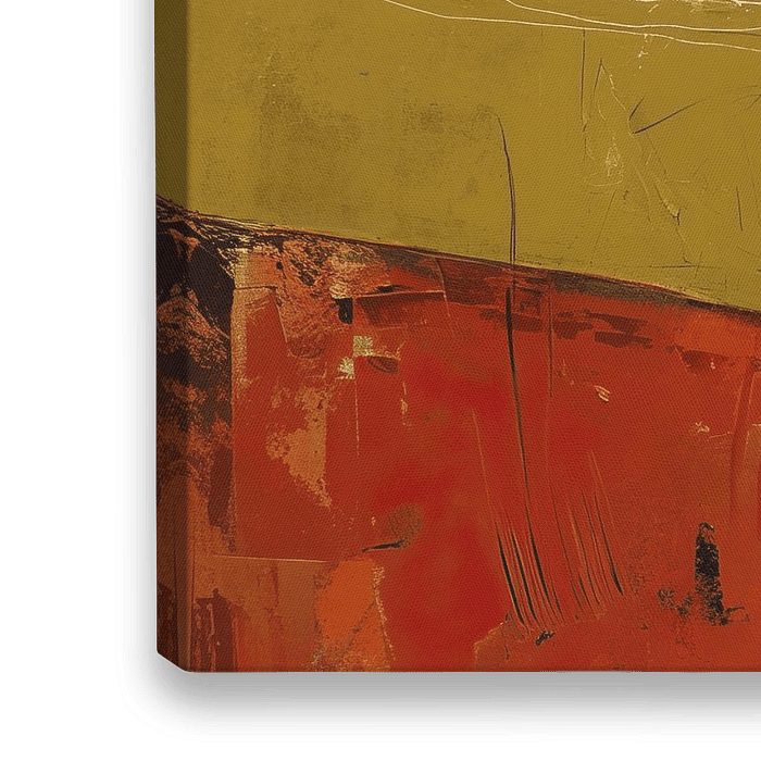 Silent Voyage - Dit abstracte schilderij vangt de essentie van twee gestileerde figuren in een boot, gedrenkt in dieprood en contrasterende neutrale kleuren, waarbij textuur en eenvoudige vormen de kijker treffen.