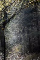 donker bos met lichtval.