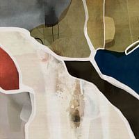 Abstract schilderij met vormen in gedempte tinten beige, olijfgroen, donkergrijs, marineblauw en oranje. Witte lijnen en randen definiëren de randen van de vormen en zorgen voor scheiding en structuur. De sfeer is kalm, rustig en ingetogen en straalt een gevoel van rust uit.
