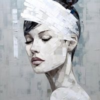 Abstract portret van een mooie serene vrouw in voornamelijk wit en grijs tinten.