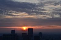 Rotterdam Centrum, onder een prachtig gekleurde wolkendek, gefotografeerd vanaf The Red Apple(127 M) met zicht op de Milleniumtoren(132M, Delftse Poort1(151M), World Trade Center(93M), Mees Pierson(89M). Verlicht en met als achtergrond de ondergaande zon.