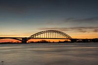 Mooi silhouet van de bekende Waalbrug bij Nijmegen. Op de achtergrond een mooie gekleurde lucht en op de voorgrond een zacht gemaakte rivier met behulp van lange sluitertijd.