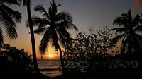 Zonsondergang op het strand van Anse Takamaka op het eiland Mahé, Seychellen. De zon schijnt door de donkere contouren van de kokospalmen.