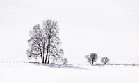 Sneeuw en winter fascineren mij en ik zoek graag naar onderwerpen om mooi vast te leggen in deze witte wereld. Hier zien we een rijtje bomen die aan de rand van een meer staan, maar door de sneeuw lijkt het een doorlopend wit kleed.