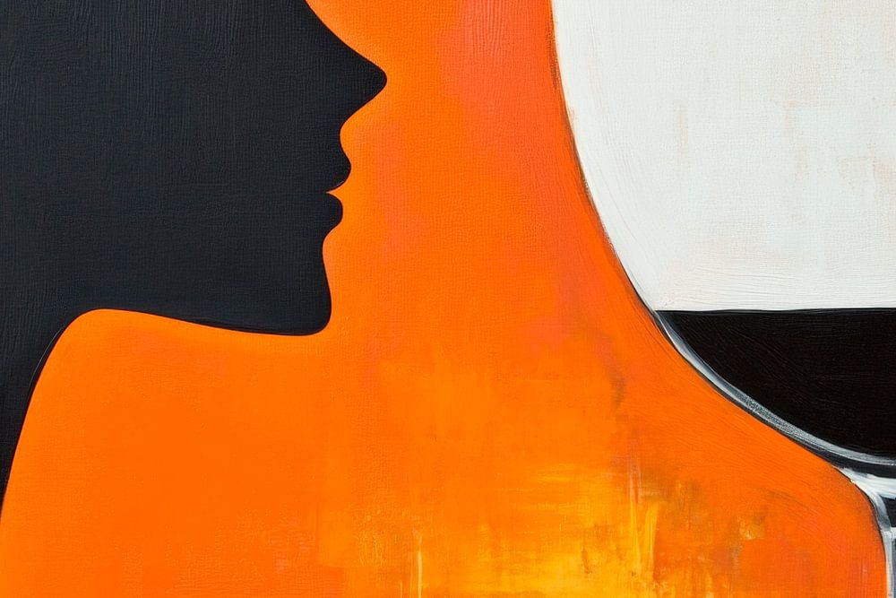 Een gestileerd silhouet ontmoet een elegant wijnglas dat schittert tegen een fel oranje achtergrond. Het gedurfde kleurcontrast en de minimalistische designtaal geven dit kunstwerk een modern tintje. Ideaal voor in de keuken of woonkamer om een uitnodigende, gezellige sfeer te creëren.
