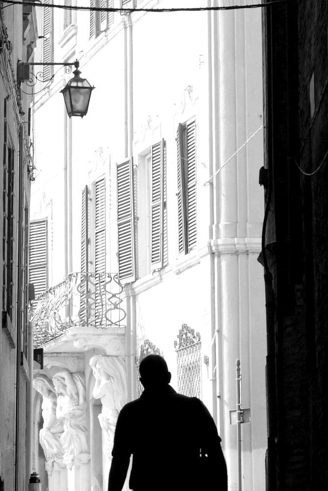 Silhouet in Italiaans steegje. Jesi, de Marche. Zwart/wit.