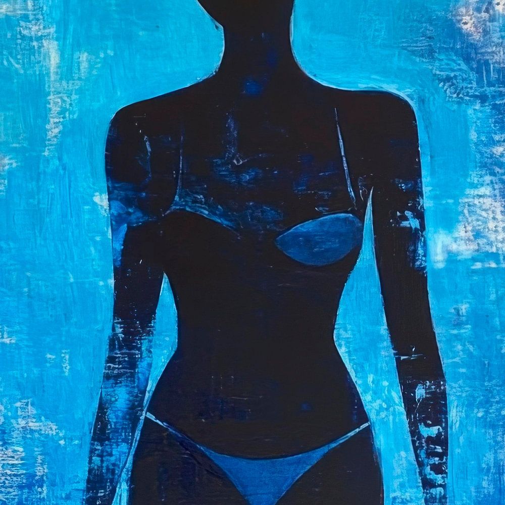 Een koele, diepblauwe achtergrond omlijst de silhouetfiguur, die krachtig en elegant lijkt. De zachte rondingen benadrukken de gratie van het lichaam, terwijl de lichte accenten van de achtergrond de contouren op mysterieuze wijze accentueren. Kracht en gratie smelten hier samen in een harmonieuze compositie die de kijker betovert.
