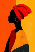 Een krachtig, grafisch portret waarin eenvoud en expressie samenkomen. Deze illustratie toont een Afrikaanse vrouw in profiel, gehuld in een grote rode hoofddoek en gouden oorring, tegen een achtergrond van warme oranje- en geeltinten. De minimalistische vormen en het sterke kleurcontrast geven het werk een moderne, bijna iconische uitstraling, terwijl de compositie een gevoel van waardigheid en rust uitstraalt.