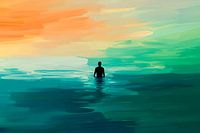 Lucht en water smelten samen in zachte tinten om een dromerig kleurenspel te creëren. Een eenzaam silhouet staat in het diepe blauw en dompelt de kijker onder in een wereld van vrede en contemplatie. Dit harmonieuze kunstwerk brengt een ontspannen sfeer in elke slaapkamer of woonkamer, perfect voor momenten van contemplatie en sereniteit.