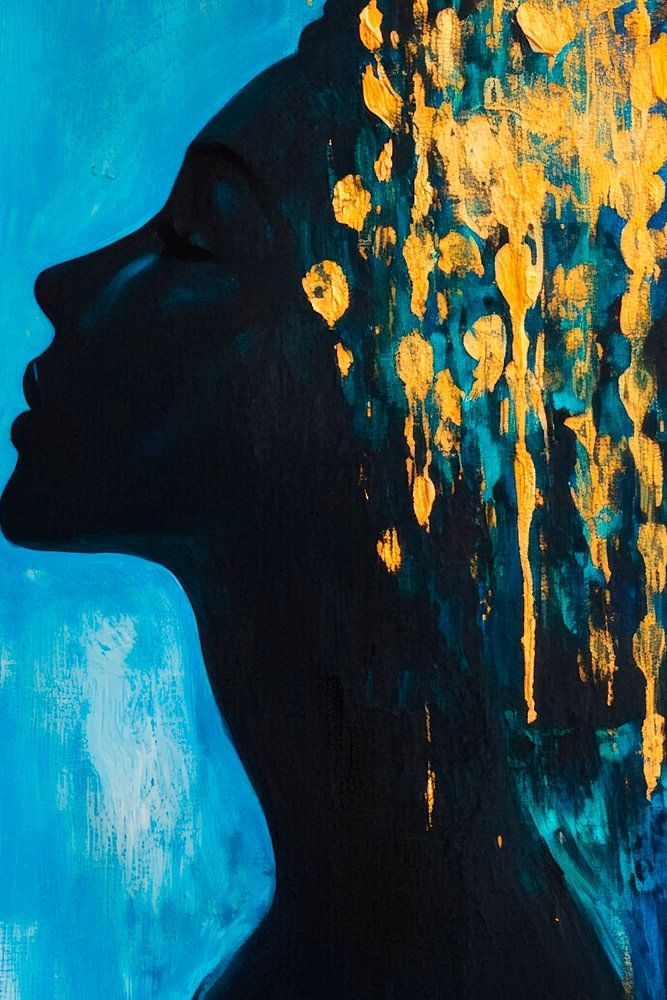 Een mysterieus silhouet glinstert tegen een diepblauwe achtergrond, terwijl gouden druppels zachtjes naar beneden regenen. Deze harmonieuze kleurencombinatie brengt een vredige stemming over en stimuleert de verbeelding. Dit kunstwerk is ideaal voor een woon- of slaapkamer en creëert een uitnodigende sfeer van inspiratie en rust.