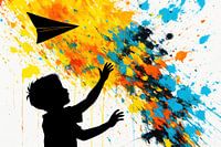 Energieke verfspatten waaieren weg van een scherp silhouet van een kind dat reikt naar een papieren vliegtuig. Het sterke contrast tussen de donkere vorm en de heldere kleuren zorgt voor spanning en beweging. Organische spatten botsen tegen strakke lijnen van het vliegtuig, waardoor een dynamisch speelmoment ontstaat. Subtiele…