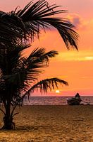 Silhouet minnaars in een boot met palmboom op het strand bij zonsondergang in Negombo Sri Lanka