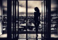 Een kunstwerk dat de essentie van Parijse elegantie en de mysterieuze bekoring van de nacht vangt. Dit silhouet van een vrouw, staand tussen open deuren met een uitzicht op de verlichte stad, is een studie in contrast en verfijning. De contouren van haar figuur zijn scherp afgetekend tegen de stedelijke lichtjes, waarbij de Eiffeltoren in de verte oprijst als een stille getuige van de tijdloze aantrekkingskracht van de stad.