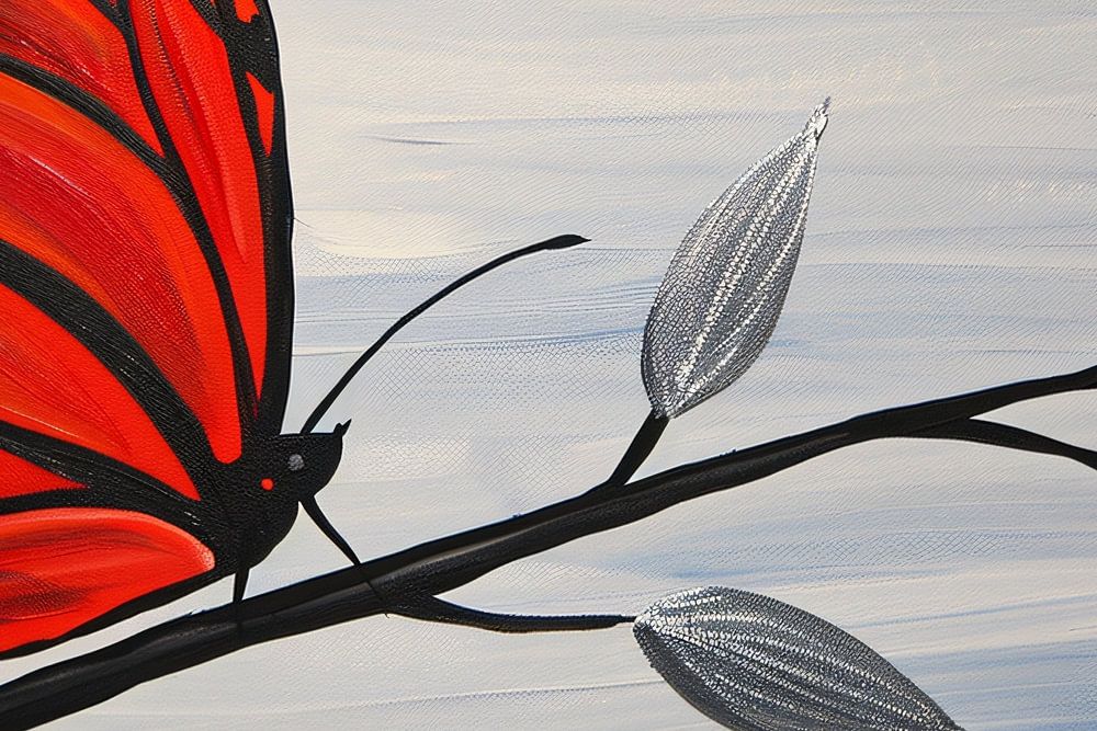 Deze prachtige schilderij toont een elegante vlinder met felrode vleugels, rustend op een tak. De subtiele grijstinten van de achtergrond en takken contrasteren mooi met de levendige kleuren van de vlinder, waardoor deze echt tot leven komt. Het kunstwerk straalt een moderne en minimalistische sfeer uit, perfect om een vleugje natuur en schoonheid toe te voegen aan je interieur. Ideaal voor de woonkamer, kantoor of slaapkamer, dit ontwerp brengt een gevoel van rust en sereniteit in elke ruimte. Voeg deze unieke decoratie toe aan je collectie en geniet dagelijks van de tijdloze elegantie en eenvoud van de natuur.