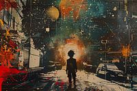 Dit kunstwerk vangt de essentie van een stedelijk landschap bij nacht, waarin een silhouet centraal staat tegen een levendige achtergrond van gloeiend oranje en mysterieus zwart. Verfspatten en abstracte vormen brengen beweging en een dynamisch gevoel over, terwijl verlaten autos en donkere gebouwen het toneel vormen. Deze compositie speelt met licht en schaduw, wat een diepe, bijna filmische sfeer creëert die de kijker uitnodigt om een verhaal te ontdekken dat zich net buiten het zichtbare afspeelt.