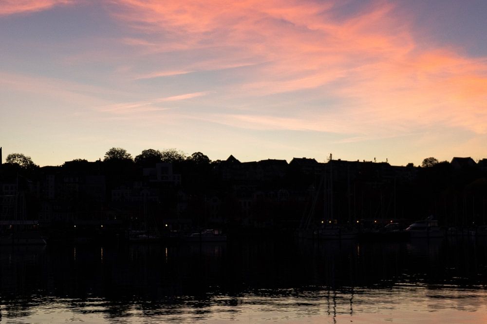 Zonsopkomst aan de haven van Flensburg. Het silhouet van Flensburg vormt een mooi contrast met de lucht en de roze wolken.