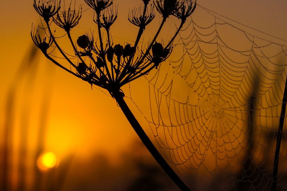 Het tegenlicht zorg voor een kleurrijke foto waarop je het silhouet van een bloem en een spinnenweb bij zonsopkomst ziet. De oranje kleur geeft een mooi contrast met het zwart.