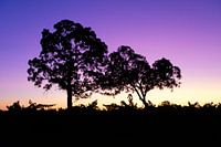 Silhouet van eucalyptus bomen bij zonsondergang met diep paarse en gele gloed aan de lucht in de wijngaarden van Coonawarra, South Australia