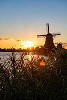 De contouren van een majestueuze Nederlandse windmolen tekenen zich af tegen de avondlucht, een iconisch beeld van de Zaanse Schans. Het hoge riet op de voorgrond wiegt zachtjes in de wind, terwijl het water erachter de warme tinten van de ondergaande zon weerspiegelt.