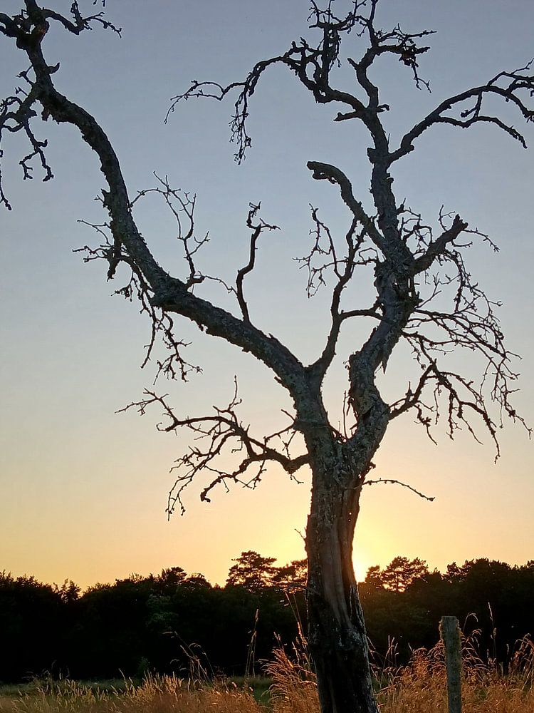 Deze indrukwekkende foto toont het krachtige silhouet van een dode boom dat zich scherp aftekent tegen de lucht. De donkere vormen van de stam en takken contrasteren prachtig met de zon die achter de boom onder gaat. Dit geeft de opname een dramatische, bijna schilderachtige uitstraling. Waar een levende boom vaak staat voor groei en energie, belichaamt dit silhouet juist verstilling, vergankelijkheid en de stille schoonheid van de natuur in haar pure eenvoud.