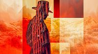 Het centrale element is een iconische cowboyvorm — geen getekende figuur, maar een uitgesneden stadsgezicht, waar ramen en brandtrappen de contouren vormen van een mysterieuze stadscowboy. De achtergrond toont een gelaagd woestijnlandschap in warme roesttinten, oker, zand en rood, gecombineerd met abstracte blokken die de sfeer versterken van vervreemding, verlatenheid en tijdloosheid.
