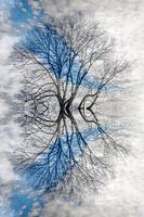 Van deze oude boom heb ik een foto gemaakt. Deze foto is gedupliceerd en gespiegeld. Op die manier is het alsof de boom weerspiegeld wordt in water. Daar waar de kale takken het zogenaamde wateroppervlak raken ontstaat een bijzonder patroon van takken die elkaar aanraken.