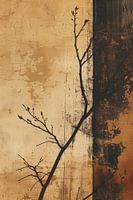 Silhouetachtige tak die omhoog groeit tegen een verweerde achtergrond in warme, aardse tinten van beige en oranje (kleur). De tak, die met zijn kale knoppen naar boven lijkt te reiken, staat in scherp contrast met de diepere, donkerdere tinten aan de rechterkant van de compositie, waar zwart en bruin de sfeer domineren. De verweerde, ruwe textuur van de achtergrond lijkt bijna als oud perkament of een verweerde muur, wat het gevoel van tijdsverloop en vergankelijkheid versterkt.