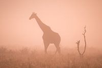Een mistige ochtend in het Kruger National Park, Zuid-Afrika. In de verte verschijnt het lange silhouet van een giraf. De zon komt op schuin achter de giraf en geeft de mist zijn roze kleur