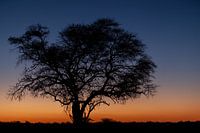 Landschapsfoto van een grote boom bij zonsopkomst. De licht verloopt van diep donkerblauw bovenaan langzaam naar warm onderaan helemaal onderaan bij de horizon. De horizon ligt vlak boven de onderkant van de foto.