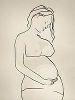 Silhouet van een zwangere, naakte vrouw die haar buik omarmd. One line drawing op beige achtergrond.
