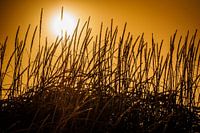 Silhouet van grashalmen tegen een door de zon oranjegekleurde achtergrond.