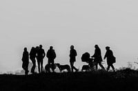 Silhouet van mensen met kinderwagen en hond in zwart-wit