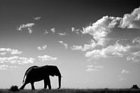 Deze indrukwekkende zwart-witfoto toont het silhouet van een olifant die vredig ronddwaalt in een uitgestrekt landschap. De minimalistische compositie en het scherpe contrast tussen de olifant en de lichtgekleurde achtergrond creëren een gevoel van rust en grootsheid. Ideaal voor natuurliefhebbers en degenen die de majestueuze aanwezigheid en stille kracht van het wild willen vastleggen in hun interieur. Dit kunstwerk brengt tijdloze elegantie en een diepe verbondenheid met de natuur in elke kamer.