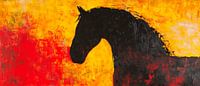 Een majestueus paard ontvouwt zich in krachtig zwart, omlijst door een levendige zonsondergang van warm geel en intens rood. De harmonieuze combinatie van kleuren straalt energie en beweging uit, ideaal voor een woonkamer waar het gesprekken stimuleert en een sfeer van vrijheid creëert.