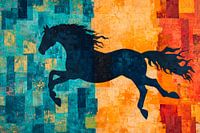 Het krachtige silhouet van een paard ontvouwt zich in levendige kleuren, majestueus springend over een harmonieus samenspel van koele en warme tinten. Deze dynamische voorstelling straalt energie en vrijheid uit, ideaal voor een woonkamer of een creatief kantoor waar inspiratie en levendigheid nodig zijn.