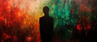 Een sfeer vol emotie en diepte ontvouwt zich in een fascinerend samenspel van levendige kleuren en mysterieuze silhouetten. De warme roodtinten vermengen zich met koele groentinten om een indrukwekkend contrast te creëren. Dit kunstwerk is ideaal voor in de woonkamer en nodigt uit tot contemplatie tijdens sociale bijeenkomsten of rustige momenten.