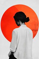Een silhouetfiguur in een effen wit overhemd staat in het midden van een krachtige oranjerode zon die de achtergrond binnendringt. Haar peinzende houding en zachte contouren zien er mystiek en uitnodigend uit, alsof ze in harmonie is met de pulserende energie van het kleurenspel om haar heen. Een harmonieus samenspel van licht en duisternis.
