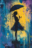 Dit kunstwerk toont een silhouet van een vrouw met een paraplu tegen een levendige achtergrond van dynamische kleuren zoals blauw, geel en paars. Het contrast tussen de donkere figuur en de kleurrijke omgeving creëert een boeiend spel van licht en schaduw. Het ontwerp straalt mysterie en energie uit, perfect als eyecatcher in een moderne ruimte. Geschikt voor liefhebbers van abstracte en expressieve kunst.