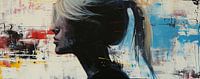 Silhouet - Met een intrigerend samenspel van abstracte en figuratieve elementen, portretteert dit doek een zijaanzicht van een persoon tegen een dynamische achtergrond waar strepen en spatten in wit, blauw en aanlokkelijk rood de aandacht trekken. Het gebruik van zwart om de contouren te benadrukken en subtiele goudaccenten verlenen het stuk een elegante, moderne uitstraling.
