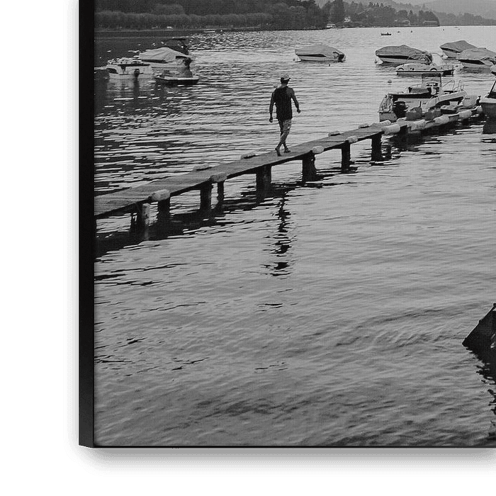 Soms lijkt een plek stil te staan in de tijd. De bergen in de verte vervagen in zachte lagen, en het meer ligt rustig voor je, vol kleine bootjes die verspreid liggen als gedachten. Op de steiger loopt een silhouet langzaam richting de horizon — klein, maar betekenisvol in het grote geheel. Het licht is zacht, bijna diffuus, en er hangt een dromerige sfeer over het hele tafereel. De kleuren zijn ingetogen, met een bijna nostalgische gloed. Niets lijkt hier haast te hebben. Dit is zo’n moment waarin alles even tot rust komt: water, bergen en mens in een stille harmonie.