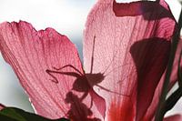 Macro-opname van een silhouette van een sprinkhaan op een roze bloem.