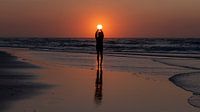Silhouet van vrouw die zon vasthoudt met reflectie in het water