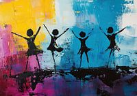 Details: abstract schilderij, dansende vrouwen, silhouetten, kleurrijk, geel,…